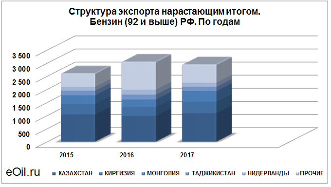 Структура экспорта бензина (92 и выше) из России нарастающим итогом по годам