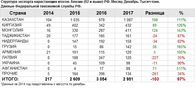 Читайте также: Структура экспорта бензина (92 и выше) из России. Декабрь 2017