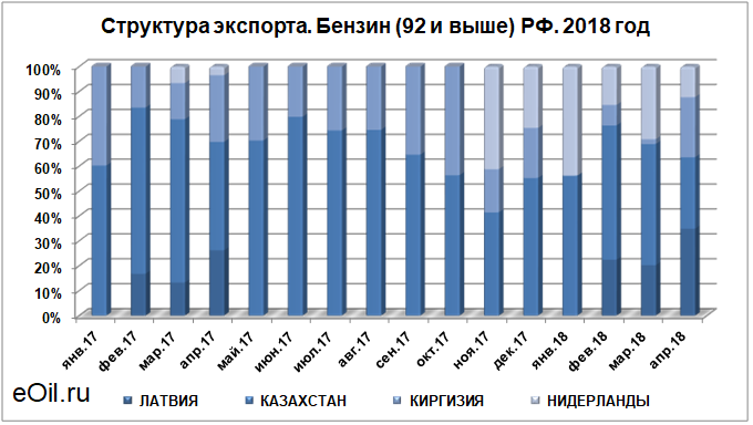 Структура экспорта бензина (92 и выше) из России с января 2018 по апрель 2018