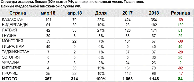 Структура экспорта бензина (92 и выше) из России с января 2018 по апрель 2018