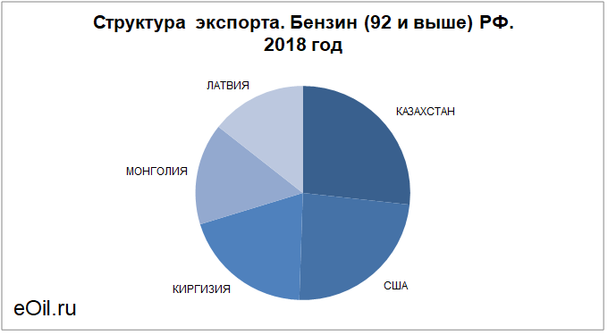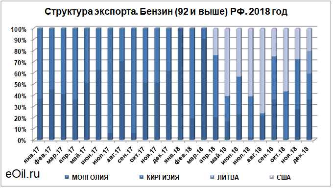 Структура экспорта бензина (92 и выше) из России с января 2018 по декабрь 2018