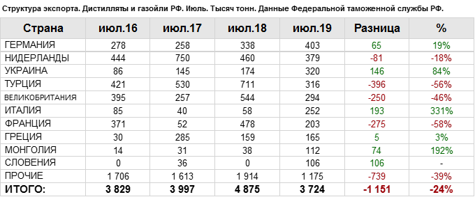 В июле 2019 года общий объем экспорта дистиллятов и газойлей составил: 3723.8 тыс. тонн.