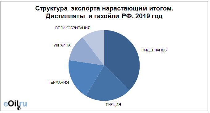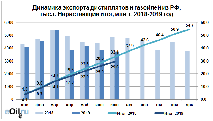 В 2019 году объем поставок дистиллятов и газойлей на экспорт достиг 29579.96 тыс. тонн. Данный объем на текущий момент составляет 54% от объема прошлого 2018 года.