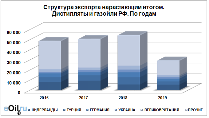 Структура экспорта дистиллятов и газойлей из России нарастающим итогом по годам