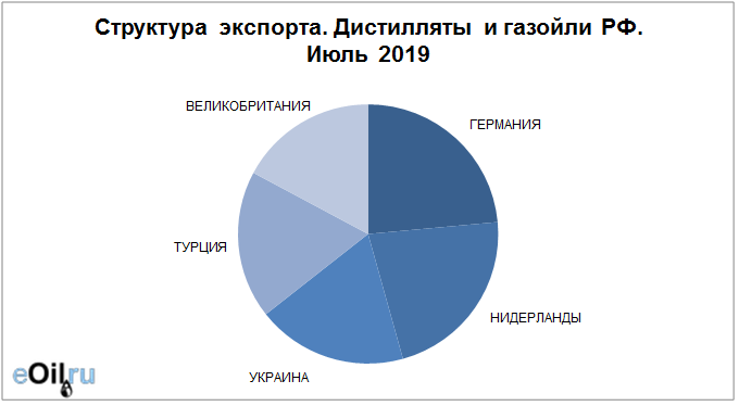 Структура экспорта дистиллятов и газойлей из России за июль 2019 года