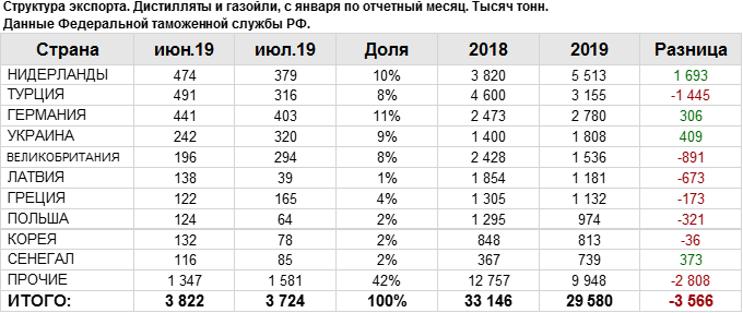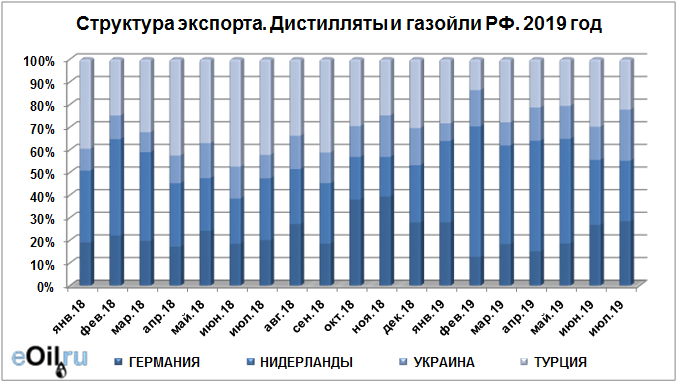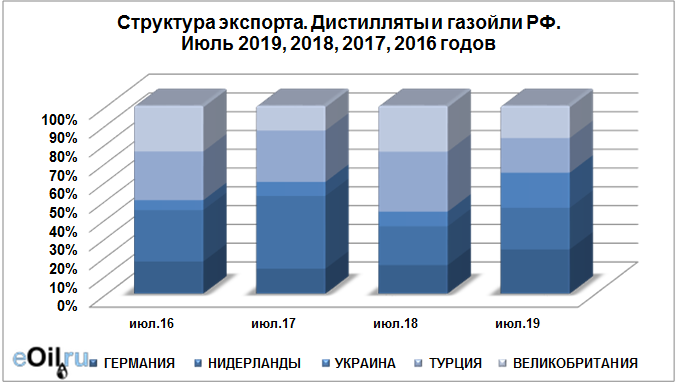 Структура экспорта дистиллятов и газойлей из России. Данные на июль 2019