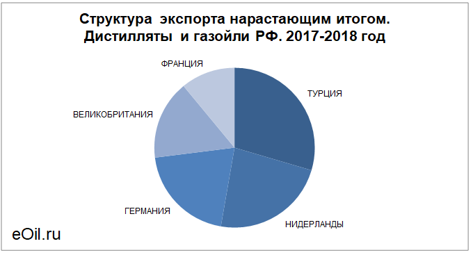 Структура экспорта дистиллятов и газойлей из России с января по декабрь 2018