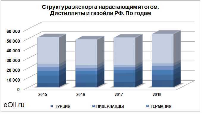 Структура экспорта дистиллятов и газойлей из России нарастающим итогом по годам