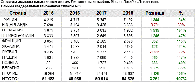 В 2018 году объем поставок дистиллятов и газойлей на экспорт достиг 54675.15 тыс. тонн. Данный объем на текущий момент составляет 107% от объема прошлого 2017 года.