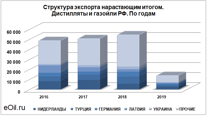 Структура экспорта дистиллятов и газойлей из России нарастающим итогом по годам