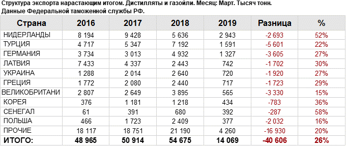 Структура экспорта дистиллятов и газойлей из России с января по март 2019