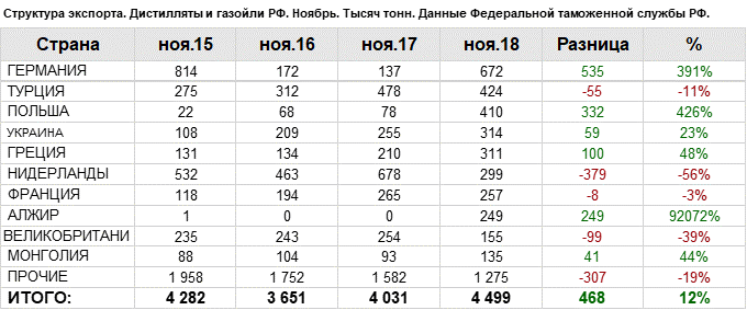 В ноябре 2018 года общий объем экспорта дистиллятов и газойлей составил: 4499 тыс. тонн.