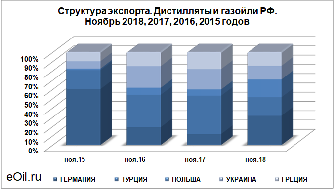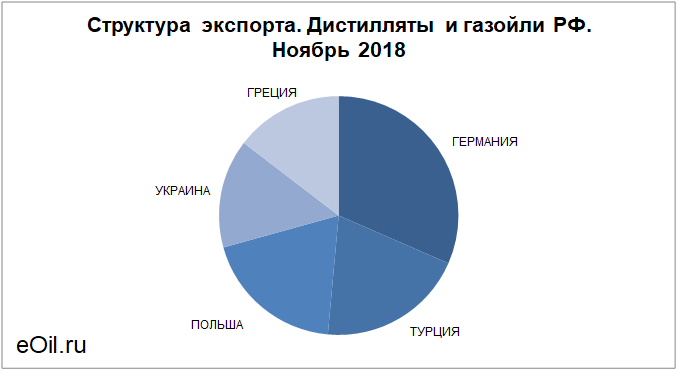Структура экспорта дистиллятов и газойлей из России. Ноябрь 2018