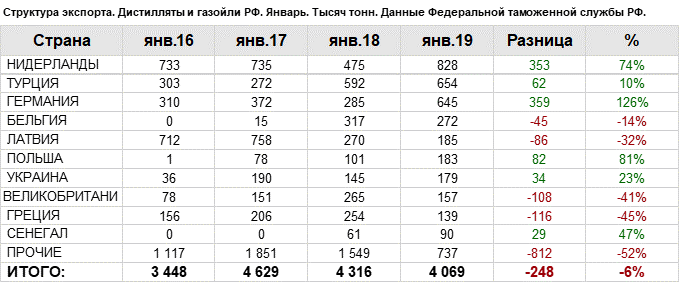 В январе 2019 года общий объем экспорта дистиллятов и газойлей составил: 4068.54 тыс. тонн.