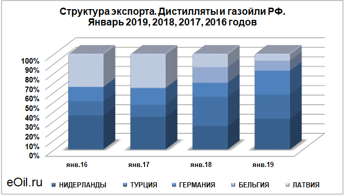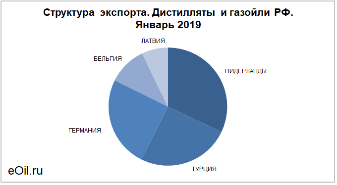 Структура экспорта дистиллятов и газойлей из России. Январь 2019