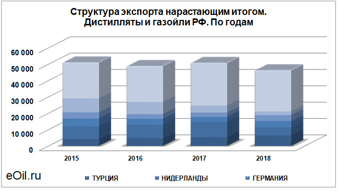 Структура экспорта дистиллятов и газойлей из России нарастающим итогом по годам