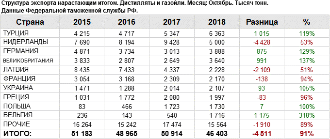 В 2018 году объем поставок дистиллятов и газойлей на экспорт достиг 46402.84 тыс. тонн. Данный объем на текущий момент составляет 91% от объема прошлого 2017 года.