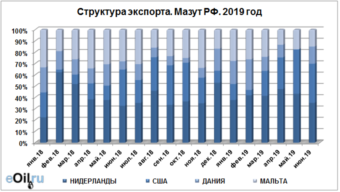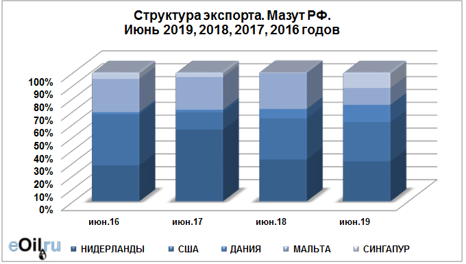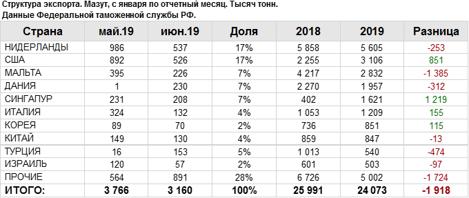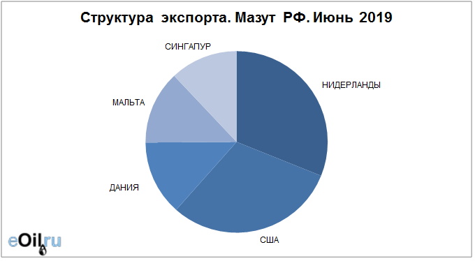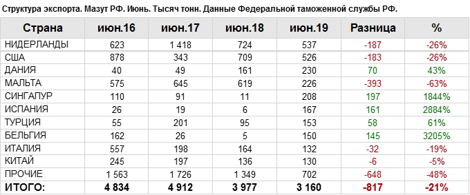 В июне 2019 года общий объем экспорта мазута составил: 3159.87 тыс. тонн.