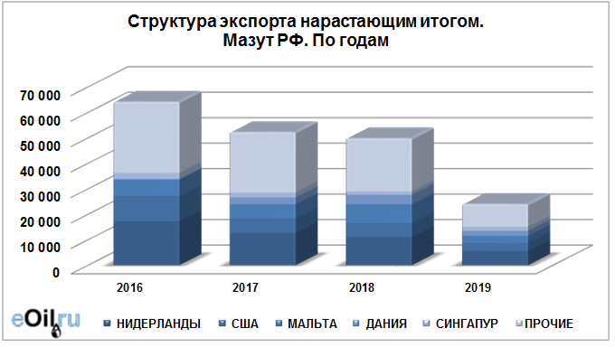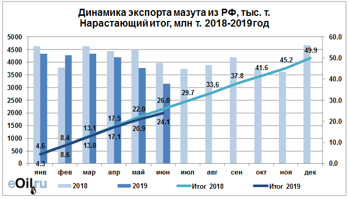 В 2019 году объем поставок мазута на экспорт достиг 24072.59 тыс. тонн. Данный объем на текущий момент составляет 48% от объема прошлого 2018 года.