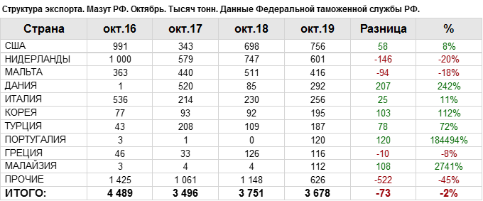 В октябре 2019 года общий объем экспорта мазута составил: 3677.58 тыс. тонн.