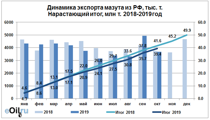В 2019 году объем поставок мазута на экспорт достиг 39395.66 тыс. тонн. Данный объем на текущий момент составляет 79% от объема прошлого 2018 года.