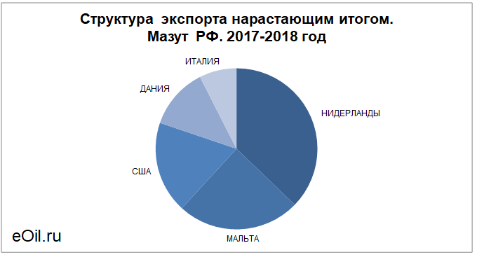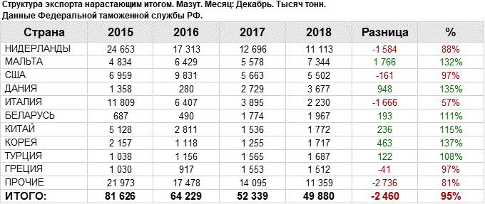 Наибольшие поставки осуществляются в Нидерланды, объем 11112.62 тыс. тонн. За прошлый 2017 год поставки в данную страну составляли 12696.35 тыс. тонн.