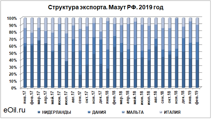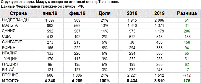 Объем поставок мазута на экспорт за период с января 2019 года по февраль 2019 года в Данию составил 1178.91 тыс. тонн, что на 206.22 тыс. тонн больше объема поставок в данную страну в 2018 году.