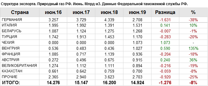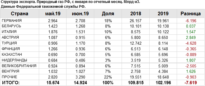 В июне 2019 года общий объем экспорта природного газа составил: 14.92 млрд. куб. м.