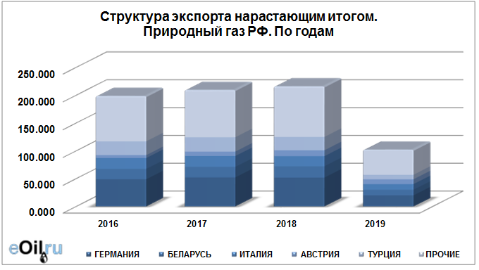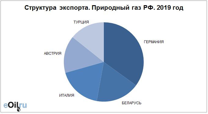 Наибольшие поставки осуществляются в Германию, объем 19.96 млрд. куб. м. За прошлый 2018 год поставки в данную страну составляли 51.93 млрд. куб. м.