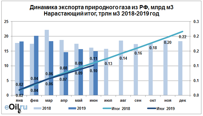 В 2019 году объем поставок природного газа на экспорт достиг 102.2 млрд. куб. м. Данный объем на текущий момент составляет 47% от объема прошлого 2018 года.