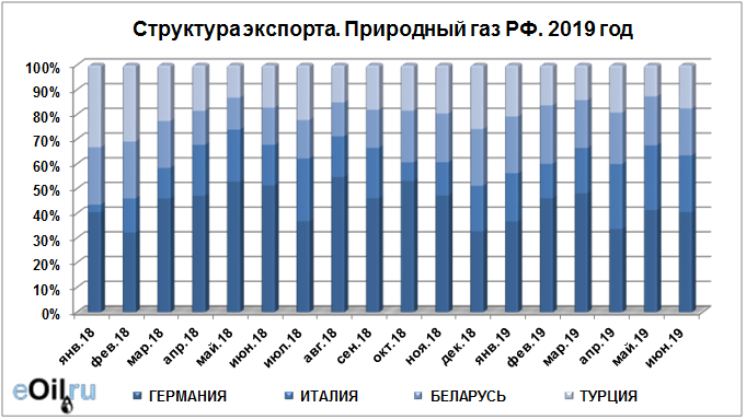 Структура экспорта природного газа из России с января 2019 по июнь 2019