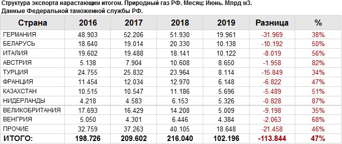 Объем поставок природного газа на экспорт за период с января 2019 года по июнь 2019 года в Германию составил 19.96 млрд. куб. м, что на -6.2 млрд. куб. м меньше объема поставок в данную страну в 2018 году.