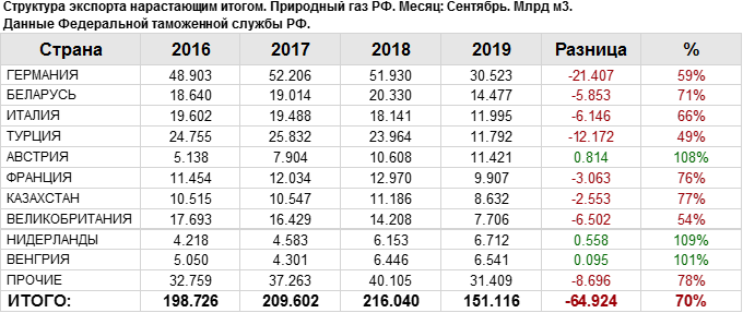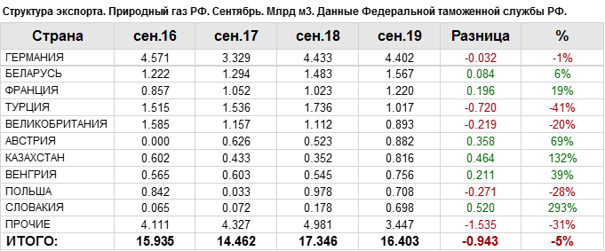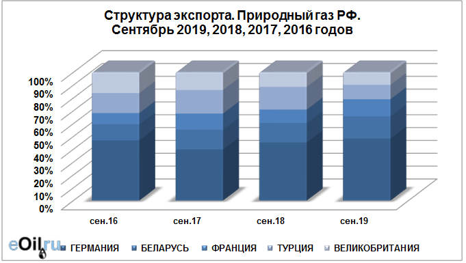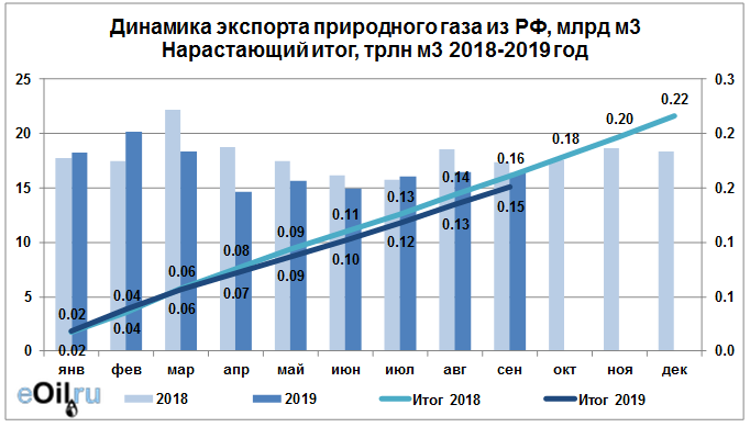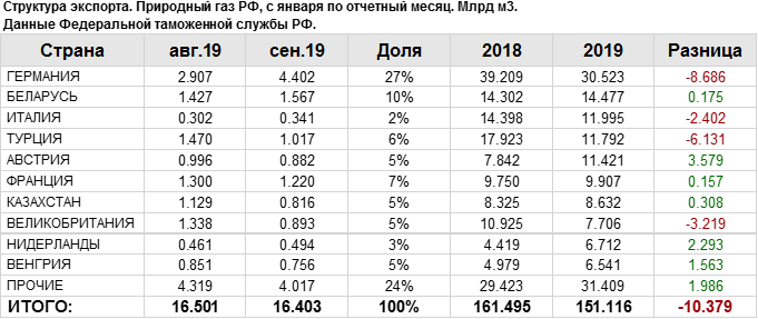 В сентябре 2019 года общий объем экспорта природного газа составил: 16.4 млрд. куб. м.