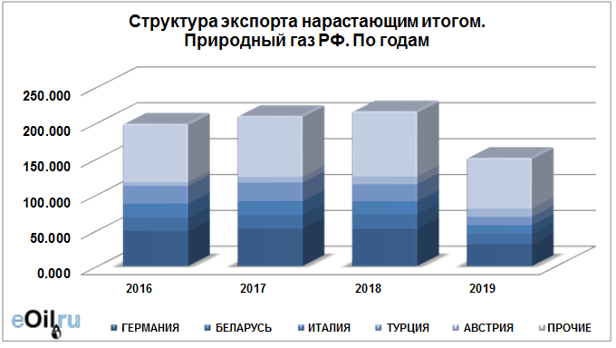 В 2019 году объем поставок природного газа на экспорт достиг 151.12 млрд. куб. м. Данный объем на текущий момент составляет 70% от объема прошлого 2018 года.