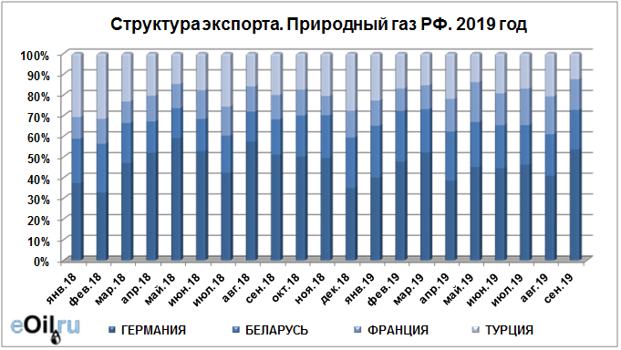 Структура экспорта природного газа из России с января 2019 по сентябрь 2019