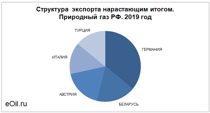 Наибольшие поставки осуществляются в Германию, объем 11.63 млрд. куб. м. За прошлый 2018 год поставки в данную страну составляли 51.93 млрд. куб. м.