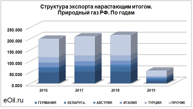 Структура экспорта природного газа из России нарастающим итогом по годам
