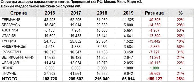 Структура экспорта природного газа из России с января 2019 по март 2019