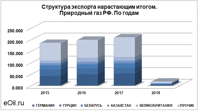 Структура экспорта природного газа из России нарастающим итогом по годам