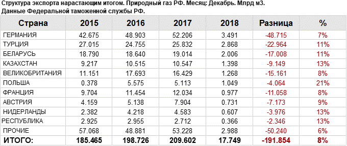 Наибольшие поставки осуществляются в Германии, объем 3.49 млрд. куб. м. За прошлый 2017 год поставки в данную страну составляли 52.21 млрд. куб. м.
