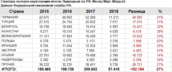Структура экспорта природного газа из России с янаваря 2018 по март 2018