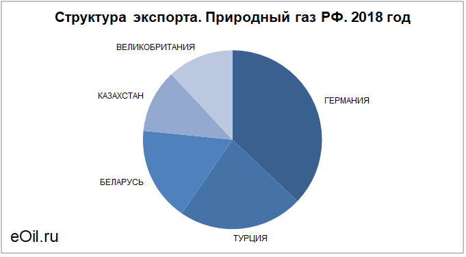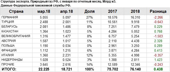 Структура экспорта природного газа из России с янаваря 2018 по апрель 2018