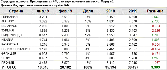 Объем поставок природного газа на экспорт за период с января 2019 года по февраль 2019 года в Австрию составил 4.57 млрд. куб. м, что на 2.74 млрд. куб. м больше объема поставок в данную страну в 2018 году.