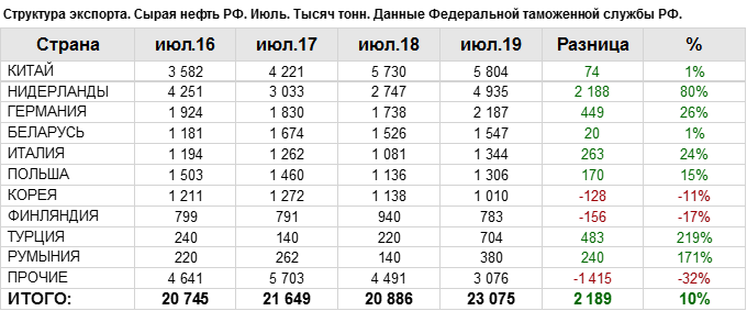 В июле 2019 года общий объем экспорта сырой нефти составил: 23074.9 тыс. тонн.