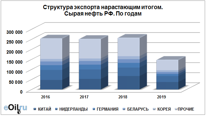 Структура экспорта сырой нефти из России нарастающим итогом по годам