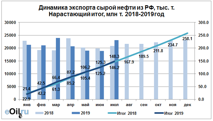 В 2019 году объем поставок сырой нефти на экспорт достиг 148269.79 тыс. тонн. Данный объем на текущий момент составляет 57% от объема прошлого 2018 года.