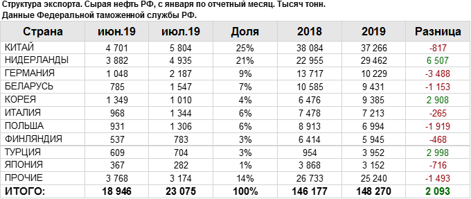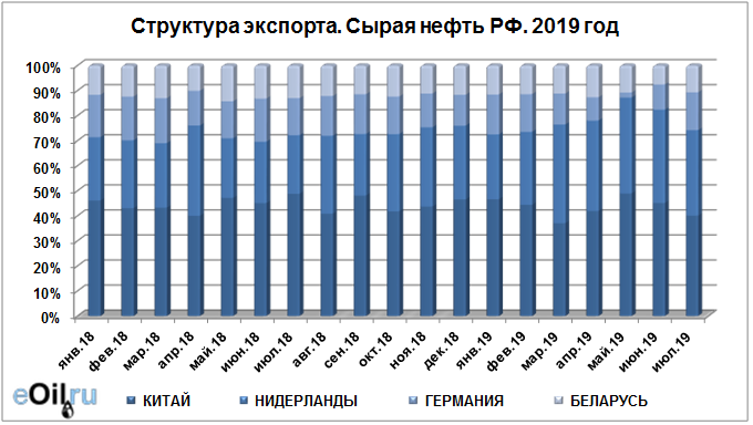 Структура экспорта сырой нефти из России с января 2019 по июль 2019