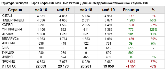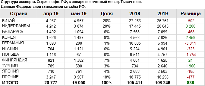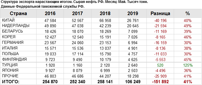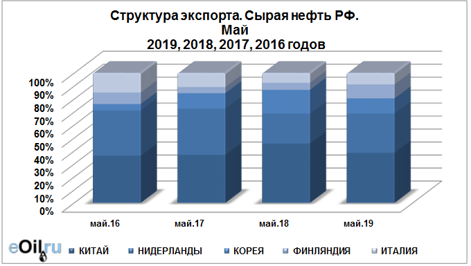 Структура экспорта сырой нефти из России. Данные на май 2019