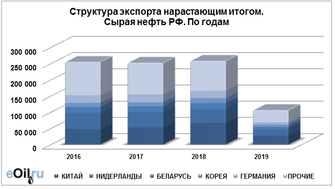 Структура экспорта сырой нефти из России нарастающим итогом по годам