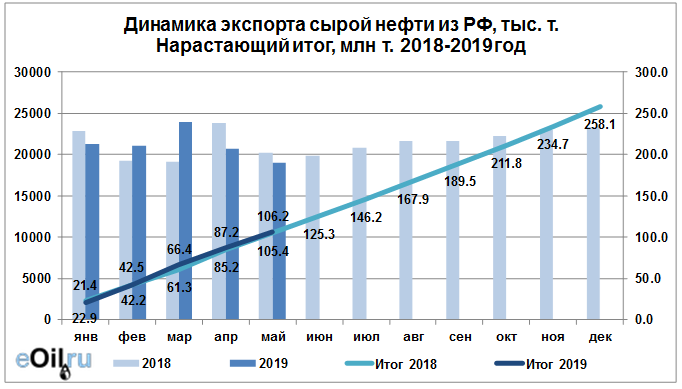 В мае 2019 года общий объем экспорта сырой нефти составил: 19050.38 тыс. тонн.